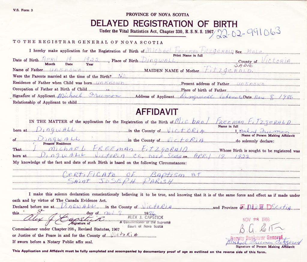 I hereby make application for the Registration of Birth of Michael FreemanFitzgerald Sex Male