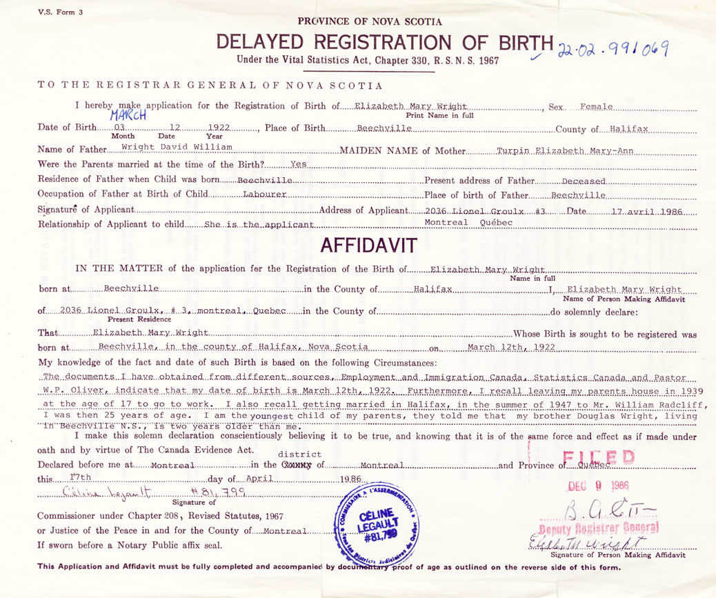 The documents I have obtained from different sources, Employment and Immigration Canada, Statistics Canada and Pastor W. P. Oliver, indicate that my date of birth is March 12th, 1922. Furthermore, I recall leaving my parents house in 1939 at the age of 17 to go to work. I also recall getting married in Halifax, in the summer of 1947 to Mr. william Radcliff, I was then 25 years of age. I am the youngest child of my parents, they told me that my brother Douglas Wright, living in Beechville, is two years older than me.