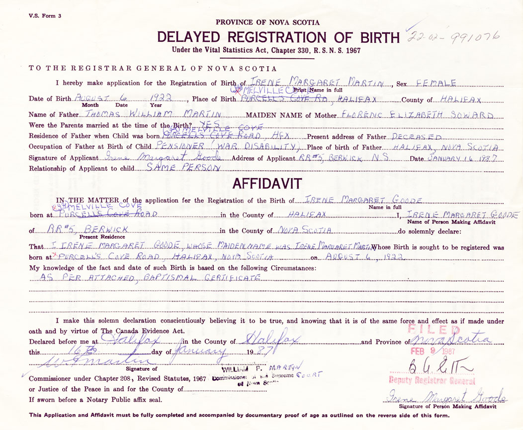 Date of Birth August 6, 1922 Place of Birth Melville CoveCounty of Halifax
