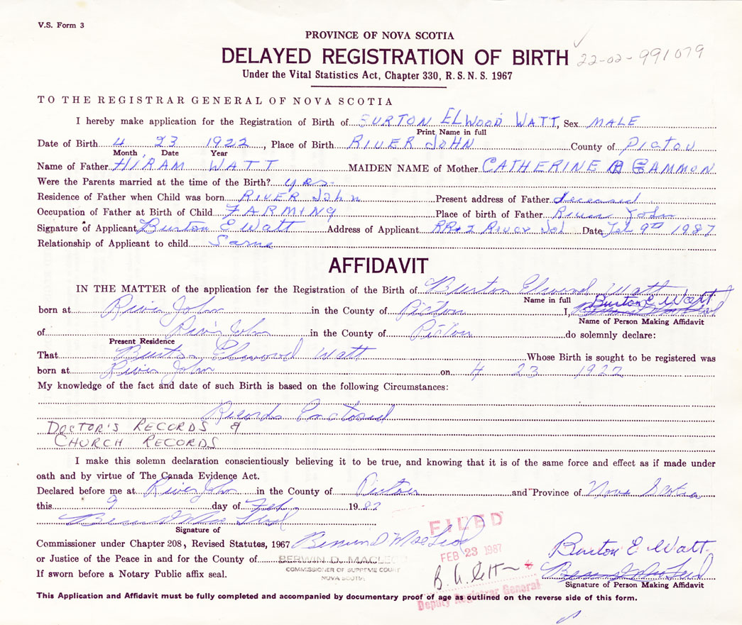 Signature of Applicant Burton E. Watt Address of Applicant RR #2, River John, Pictou Date 9 February 1987