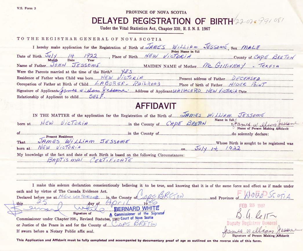 Date of Birth July 14, 1922 Place of Birth New VictoriaCounty of Cape Breton