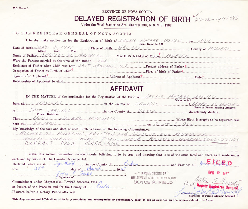 I hereby make application for the Registration of Birth of Laurie MacRaeMaxwell Sex Male