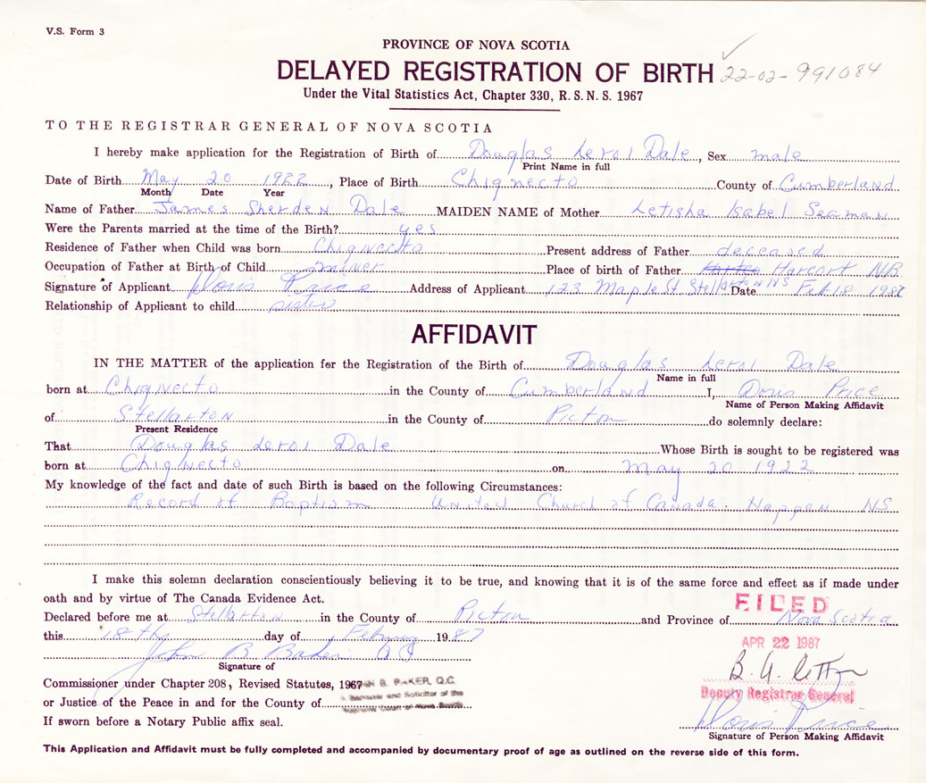 I hereby make application for the Registration of Birth of Douglas LeroiDale Sex Male