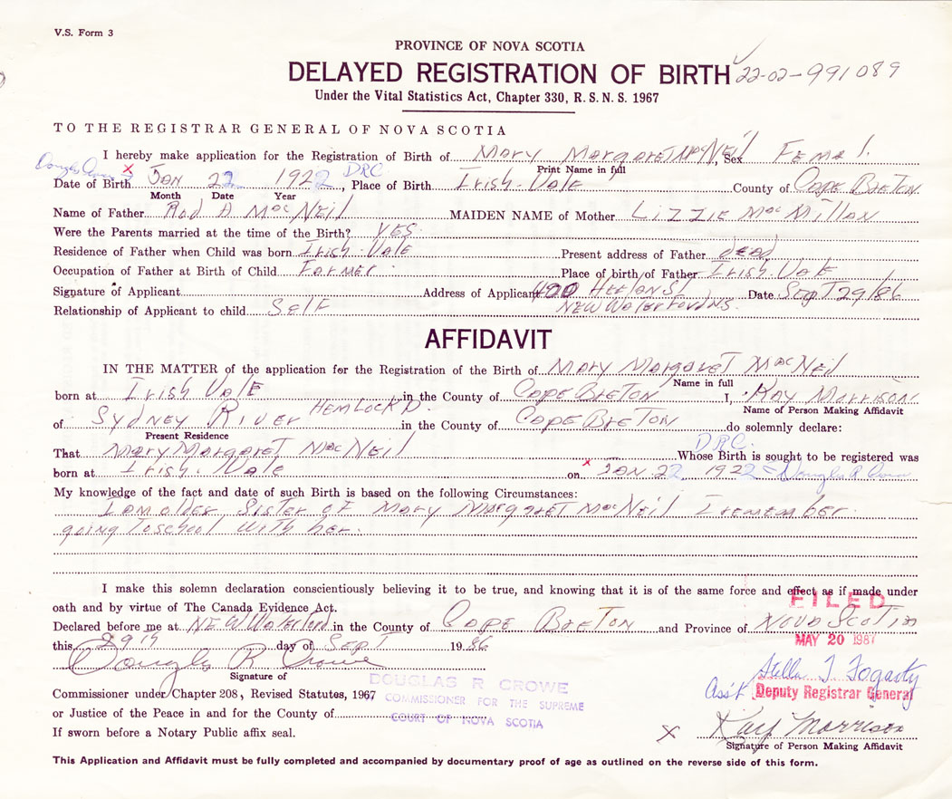 That Mary MargaretMacNeil Whose Birth is sought to be registered was