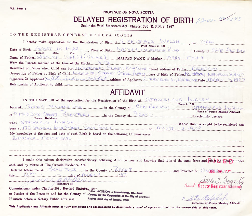 Signature of Applicant Stanislaus Walsh Address of Applicant 9 Marlboro Street, Brantford, Ontario Date 13 March 1987