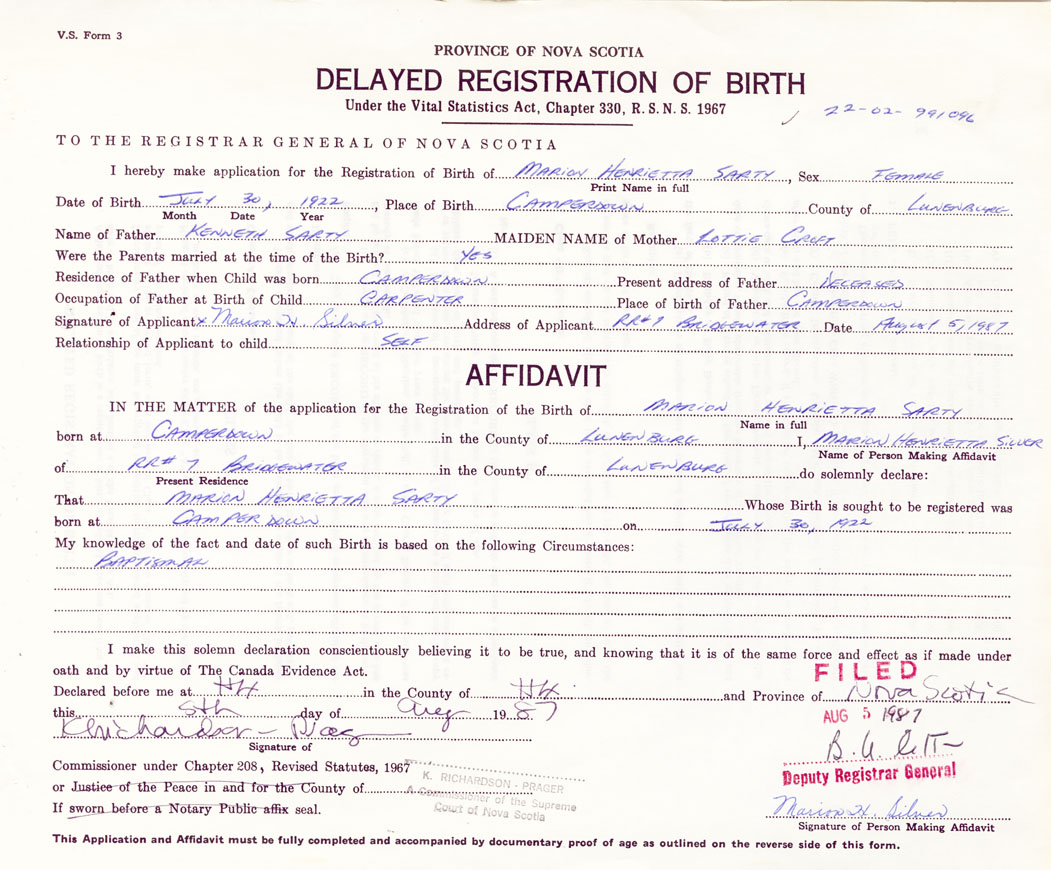 Date of Birth July 30, 1922 Place of Birth CamperdownCounty of Lunenburg