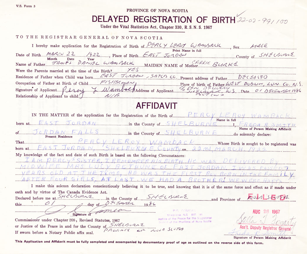 Signature of Applicant Percy L. Wamback Address of Applicant c/o General Delivery, Shelburne B0T 1W0 Date 1 December 1986