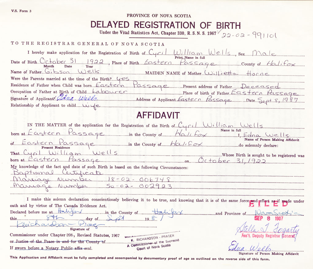 Date of Birth October 31, 1922 Place of Birth Eastern PassageCounty of Halifax