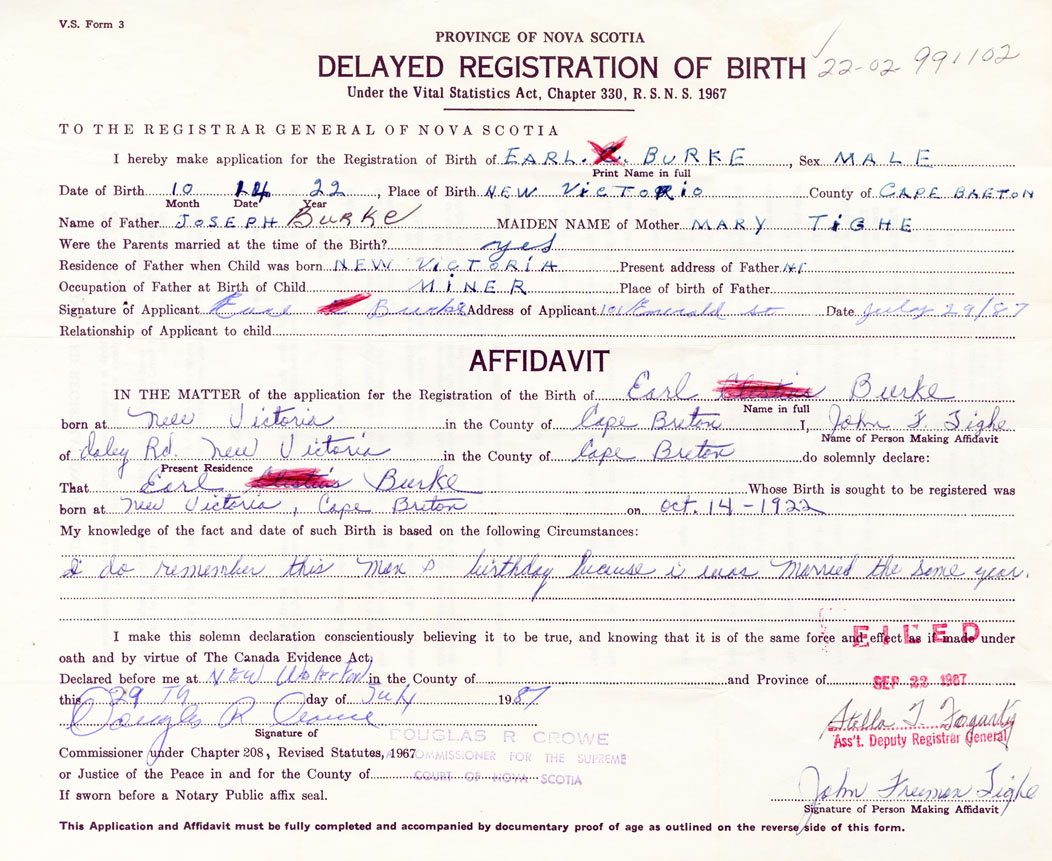 Date of Birth October 14, 1922 Place of Birth New VictoriaCounty of Cape Breton