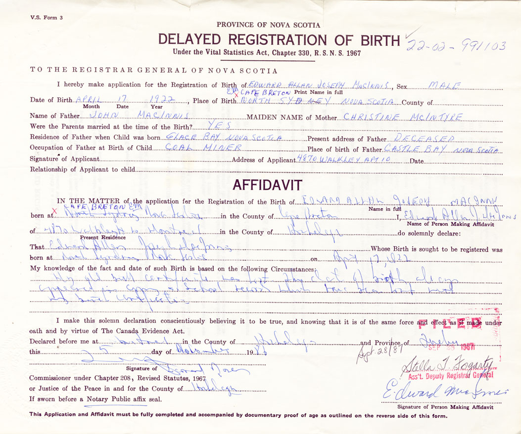 I hereby make application for the Registration of Birth of Edward Allan JosephMacInnis Sex Male
