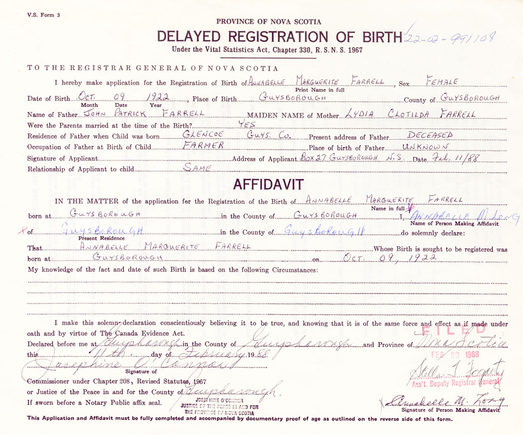 Signature of Applicant Annabelle M. Farrell Address of Applicant Box 27, Guysborough Date 11 February 1988