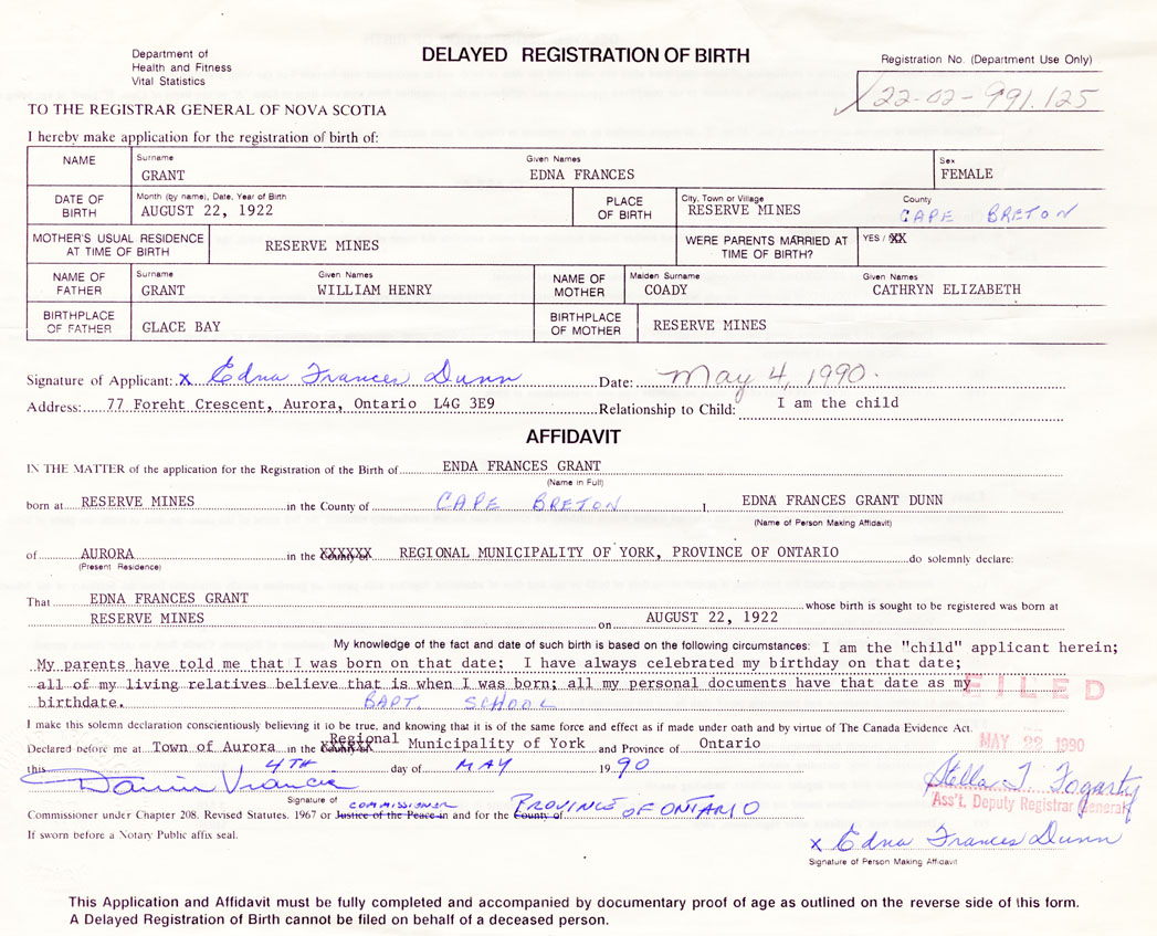Signature of Applicant Edna Frances Dunn Address of Applicant 77 Foreht Crescent, Aurora, Ontario, L4G 3E9 Date 4 May 1990