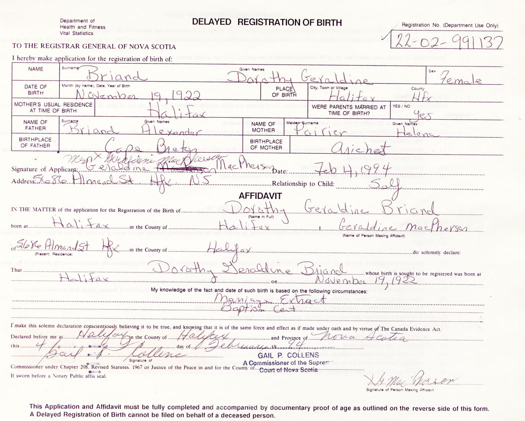 I hereby make application for the Registration of Birth of Dorothy GeraldineBriand Sex Female