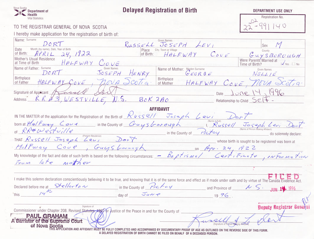 Date of Birth April 24, 1922 Place of Birth Halfway CoveCounty of Guysborough