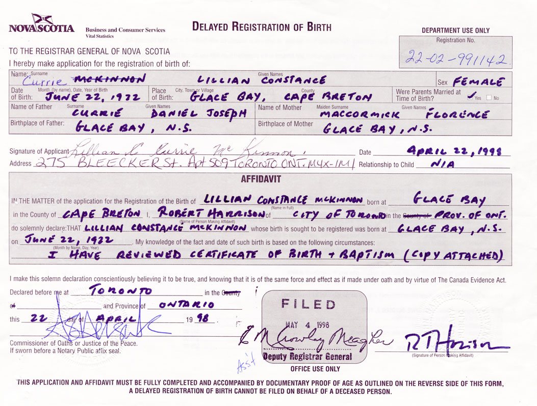 Signature of Applicant Lillian C. Currie McKinnon Address of Applicant 275 Bleecker Street, Apt 509, Toronto, Ontario, M4X 1M1 Date 22 April 1998