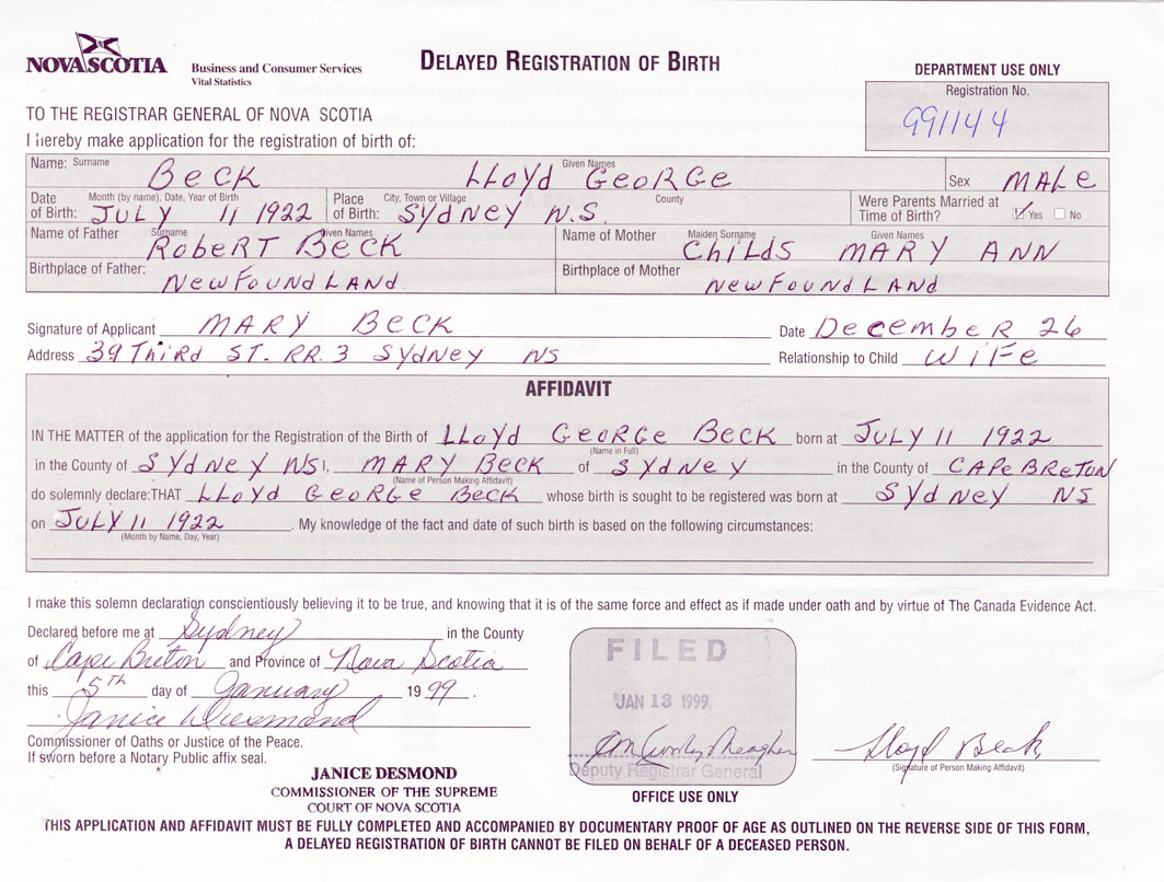 Signature of Applicant Mary Beck Address of Applicant 39 Third Street, RR #3, Sydney, Cape Breton Date 26 December 1999