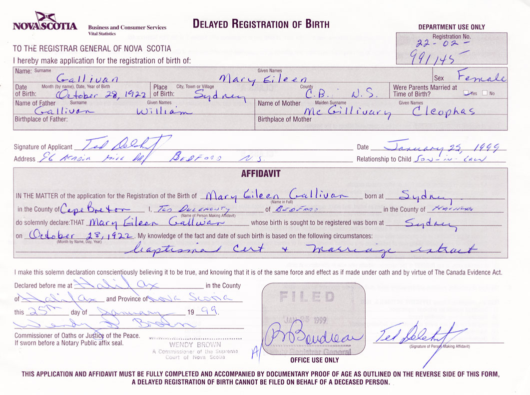 I hereby make application for the Registration of Birth of Mary EileenGallivan Sex