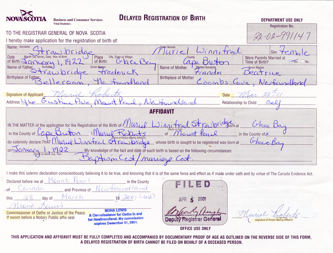 Signature of Applicant Muriel Roberts Address of Applicant 46 Gushue Avenue, Mount Pearl, Newfoundland Date 28 March 2001