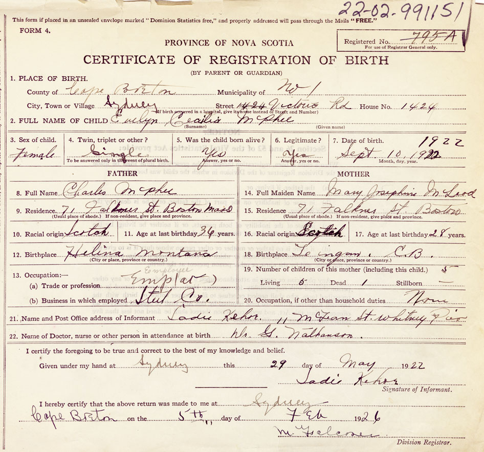 Date of Birth September 10, 1922 Place of Birth SydneyCounty of Cape Breton