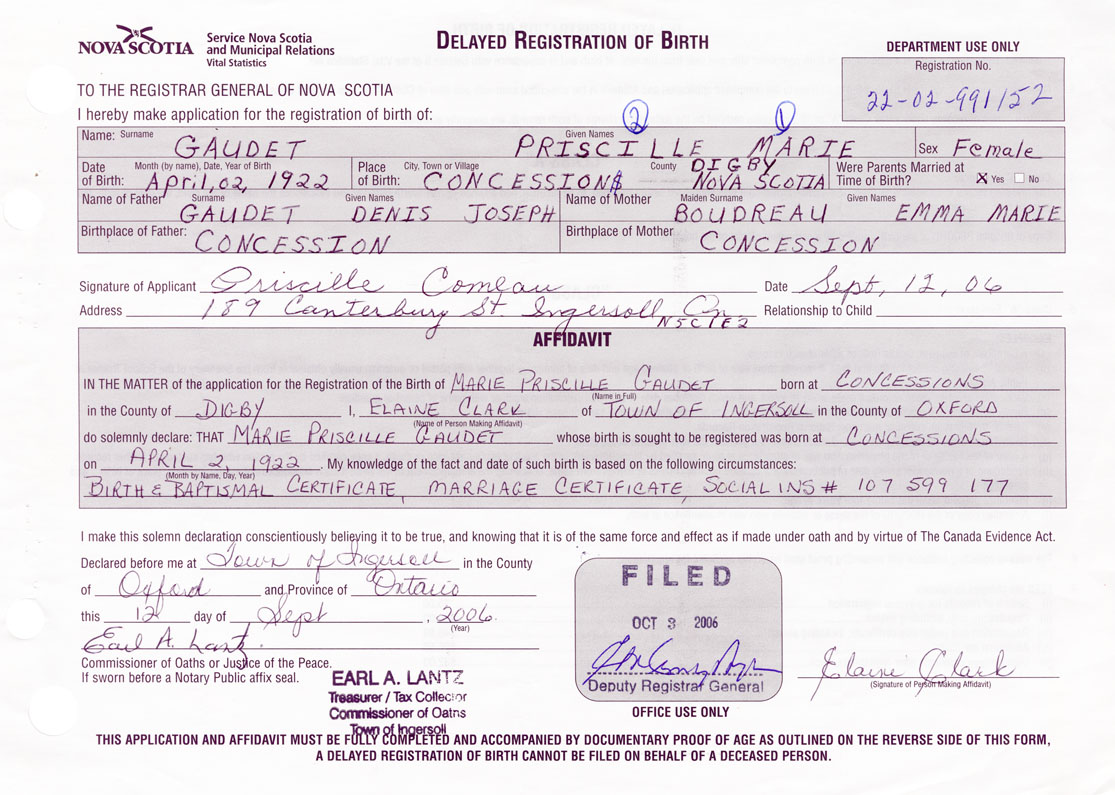 Date of Birth April 2, 1922 Place of Birth ConcessionCounty of Digby