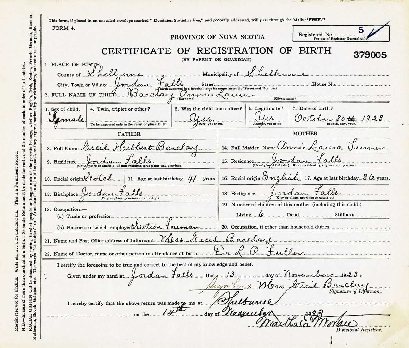 Female Birth Registration: Year: 1923 number: 37900005