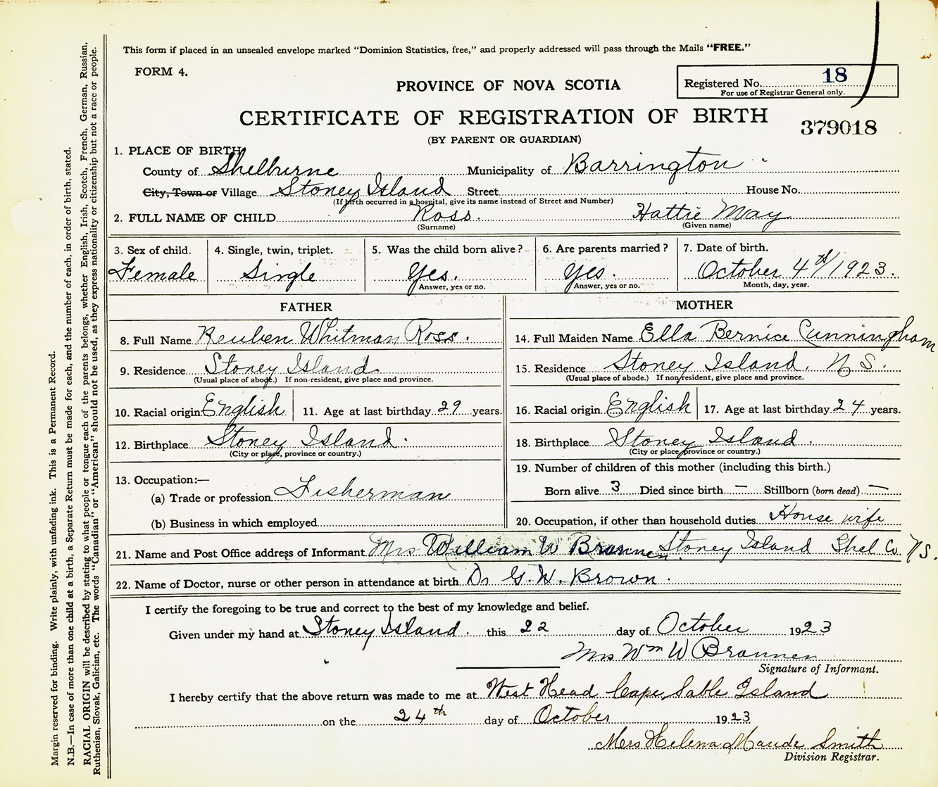 Female Birth Registration: Year: 1923 number: 37900018
