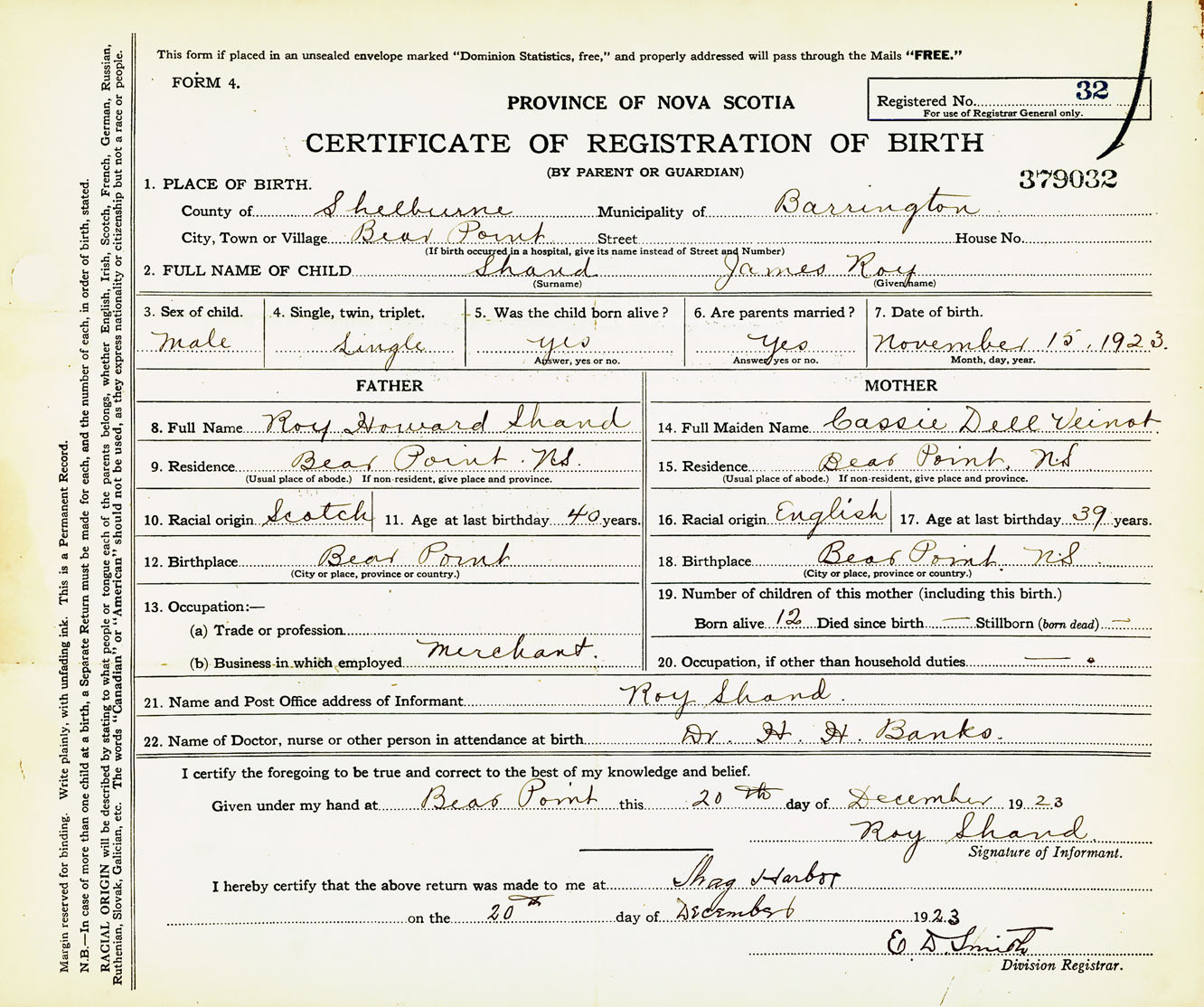 Male Birth Registration: Year: 1923 number: 37900032