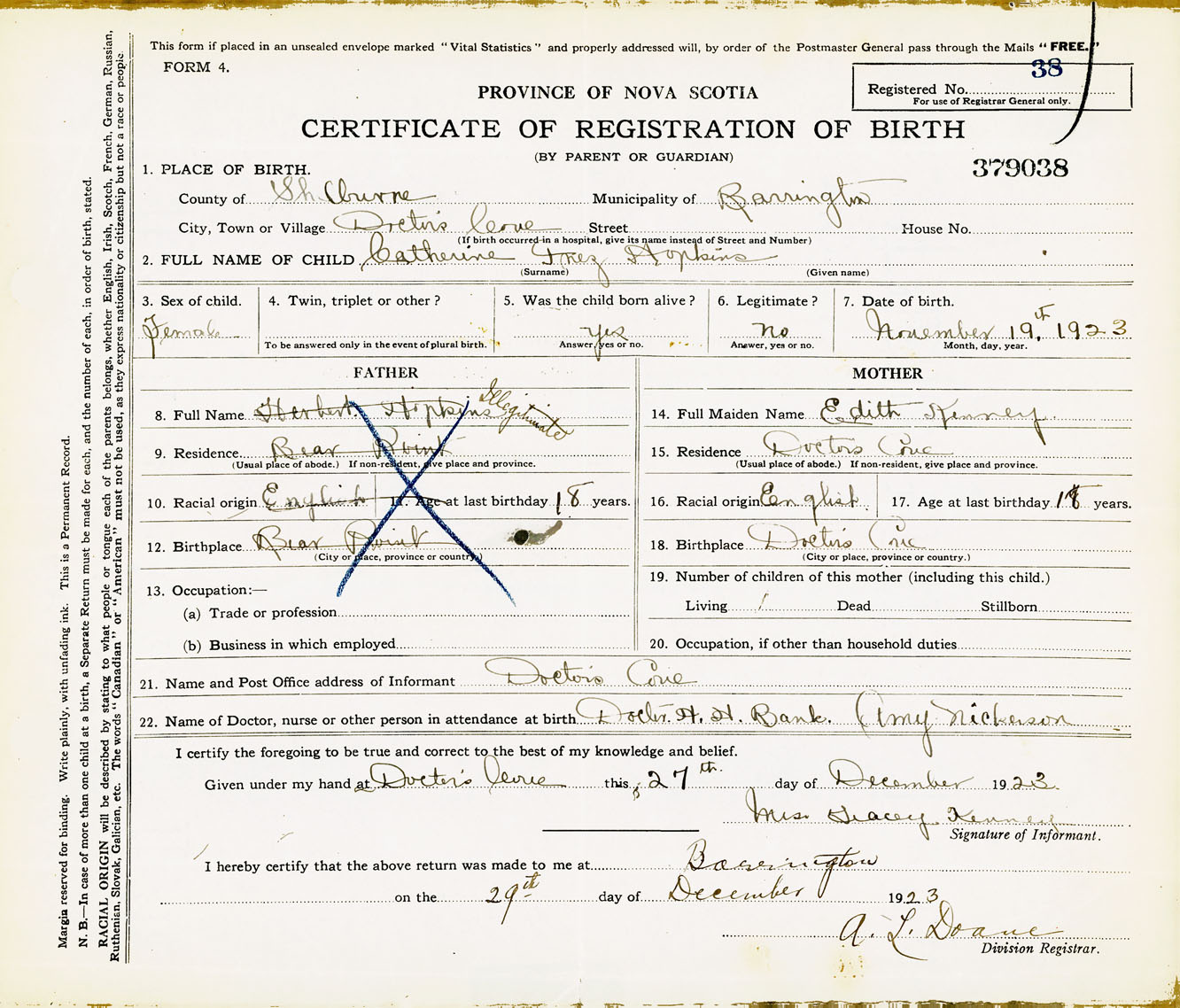Female Birth Registration: Year: 1923 number: 37900038