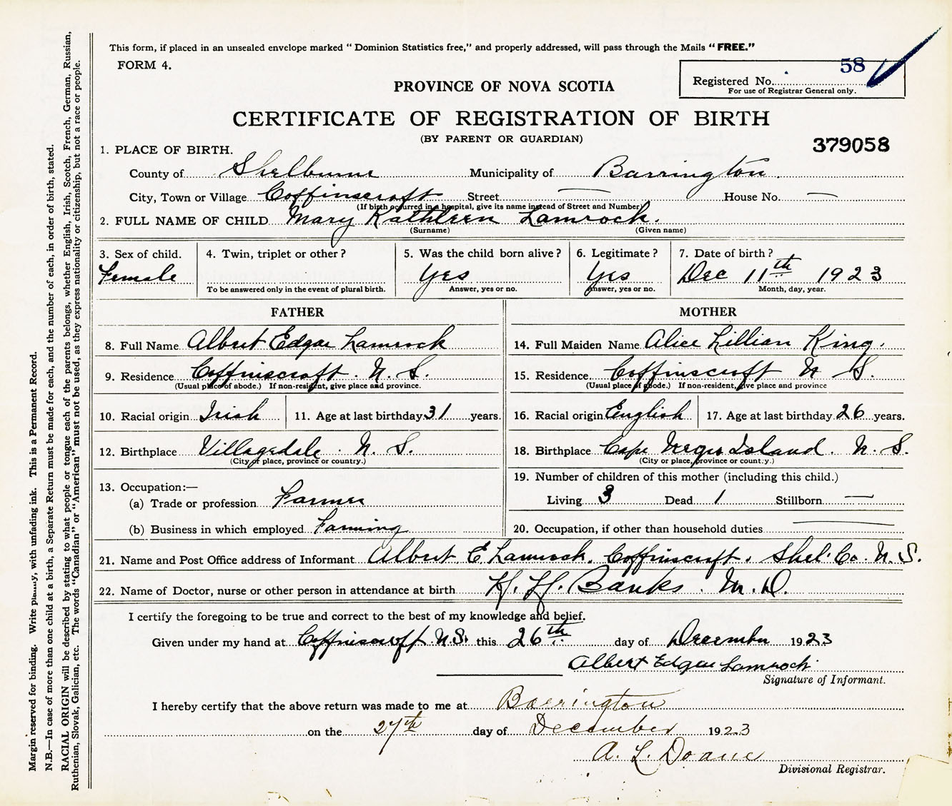 Female Birth Registration: Year: 1923 number: 37900058
