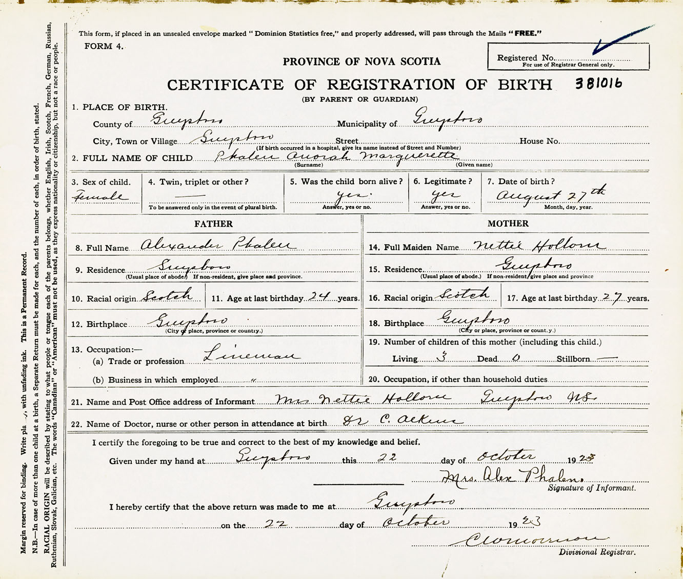 Female Birth Registration: Year: 1923 number: 38100016