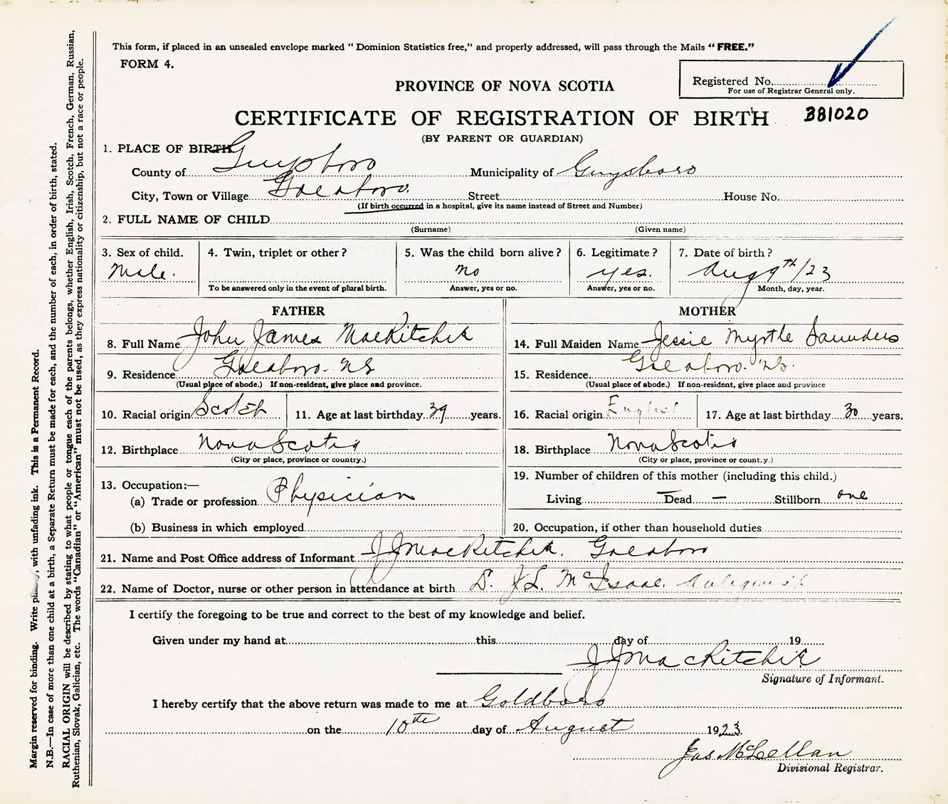 Male Birth Registration: Year: 1923 number: 38100020