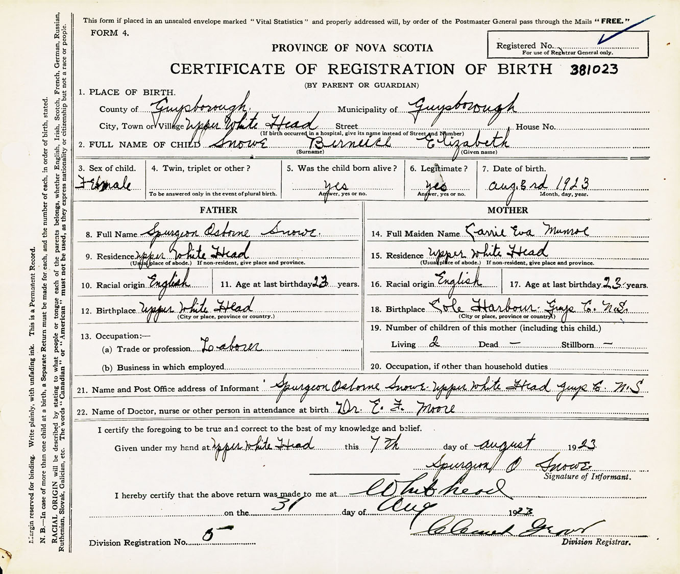 Female Birth Registration: Year: 1923 number: 38100023