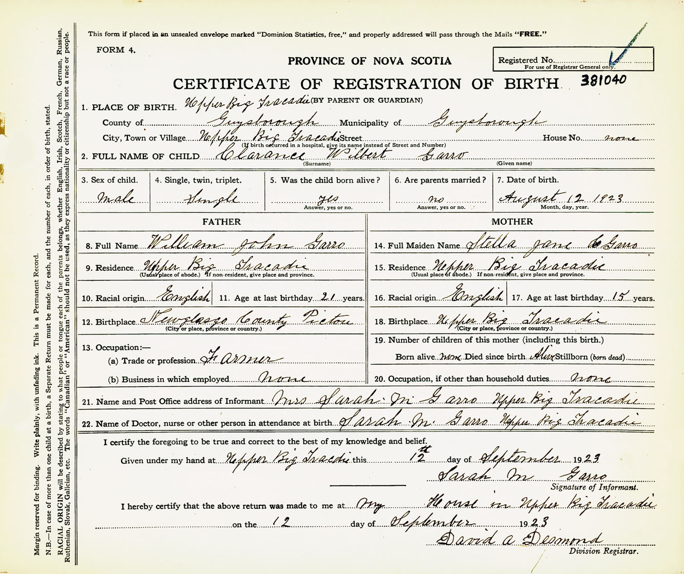 Male Birth Registration: Year: 1923 number: 38100040