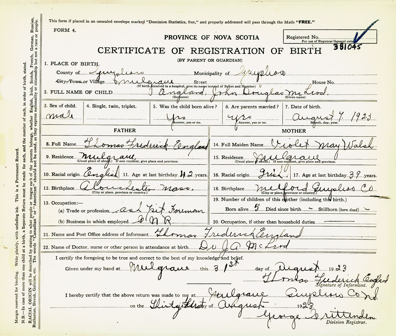 Male Birth Registration: Year: 1923 number: 38100045