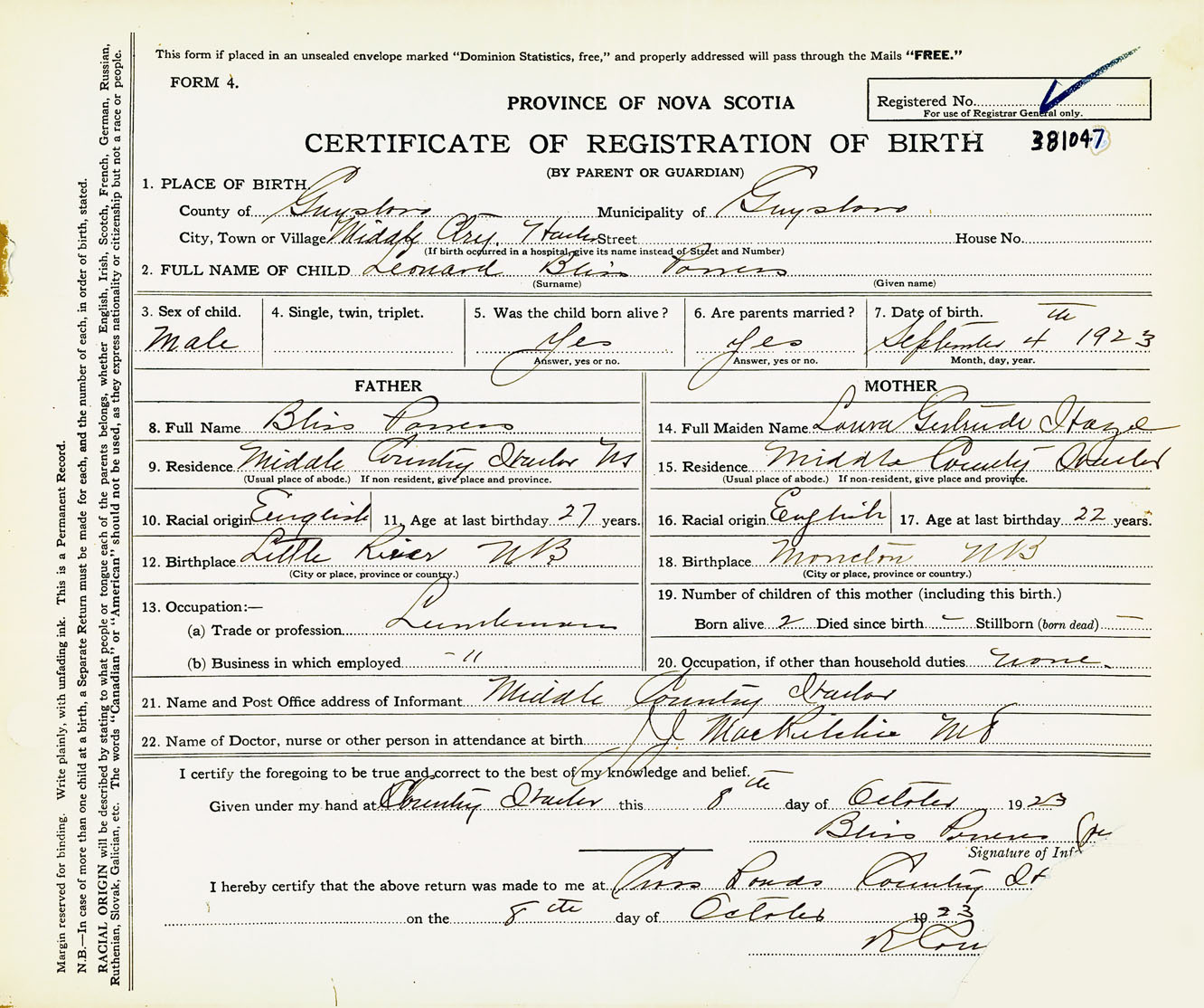Male Birth Registration: Year: 1923 number: 38100047