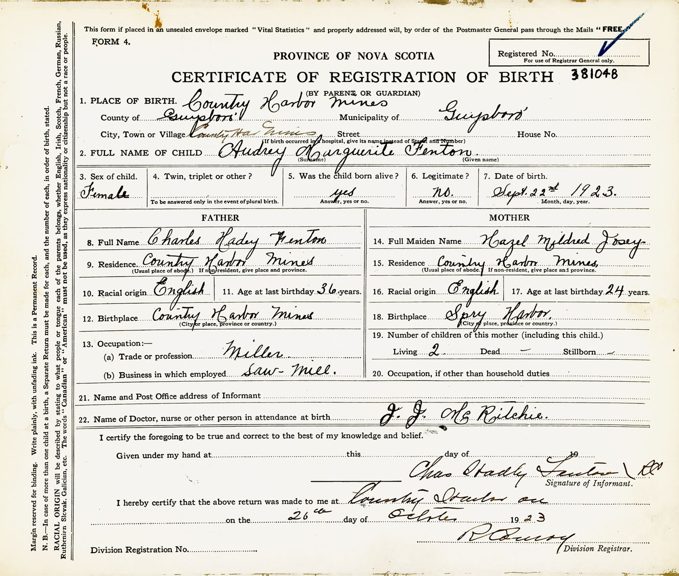 Female Birth Registration: Year: 1923 number: 38100048