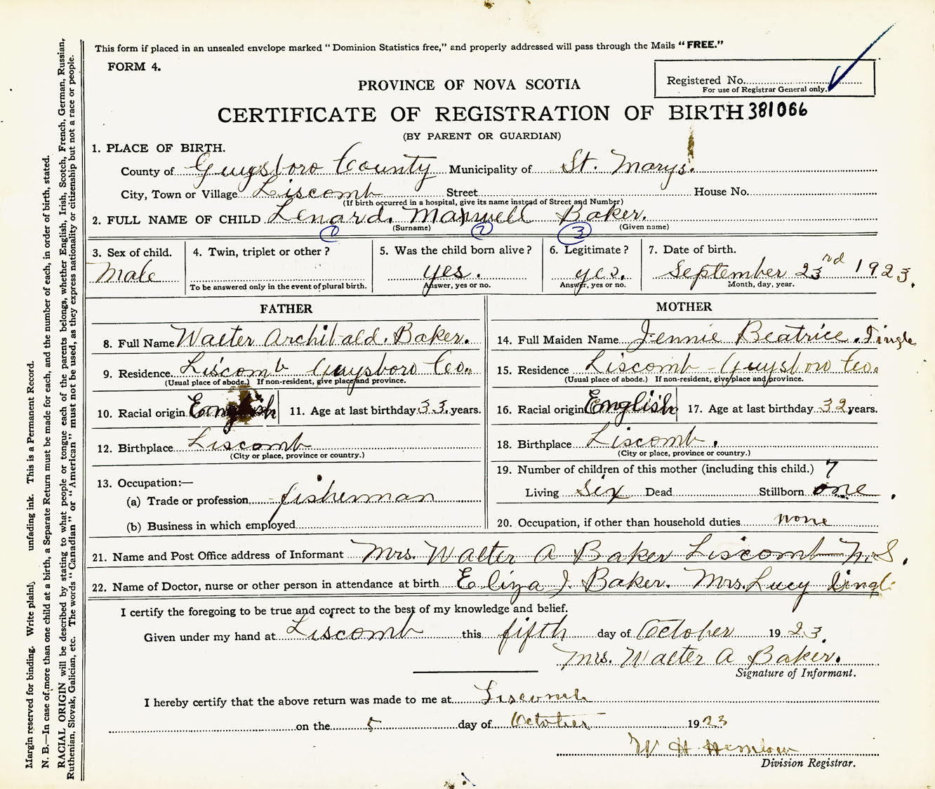 Male Birth Registration: Year: 1923 number: 38100066