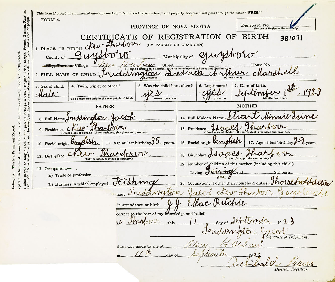 Male Birth Registration: Year: 1923 number: 38100071