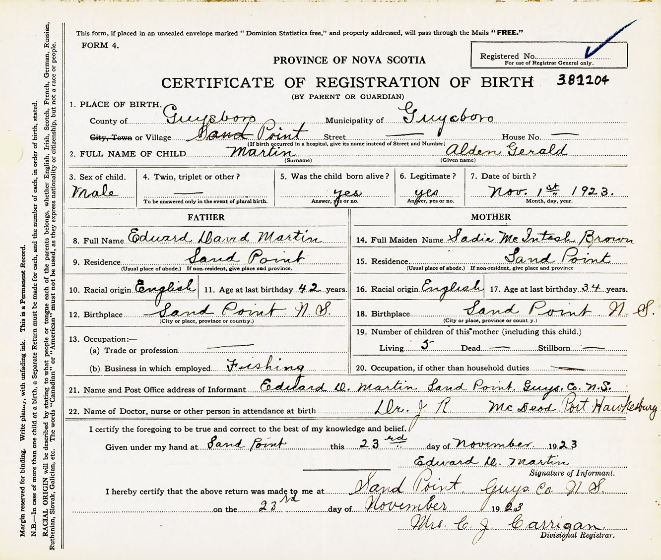 Male Birth Registration: Year: 1923 number: 38100104