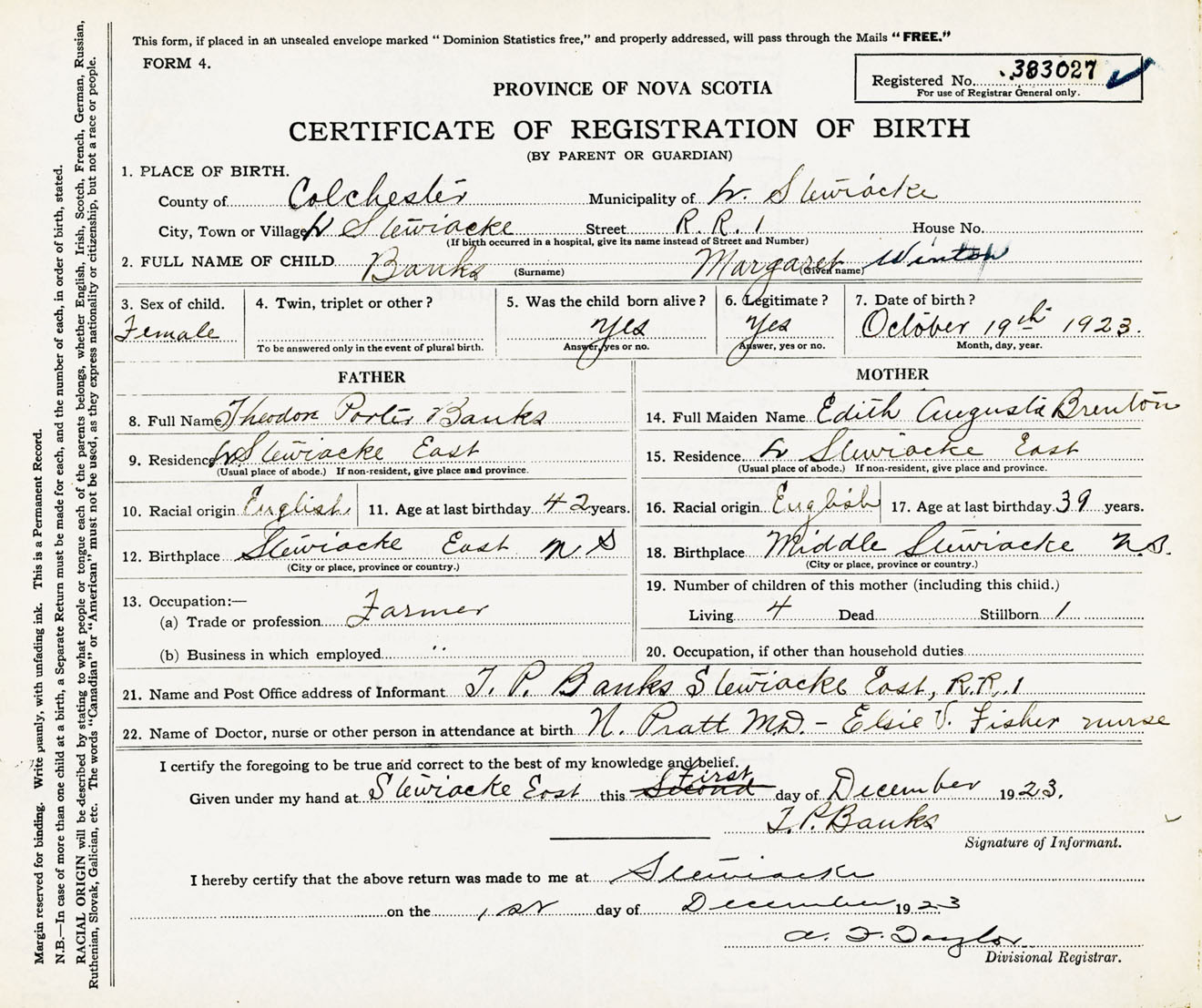 Female Birth Registration: Year: 1923 number: 38300027
