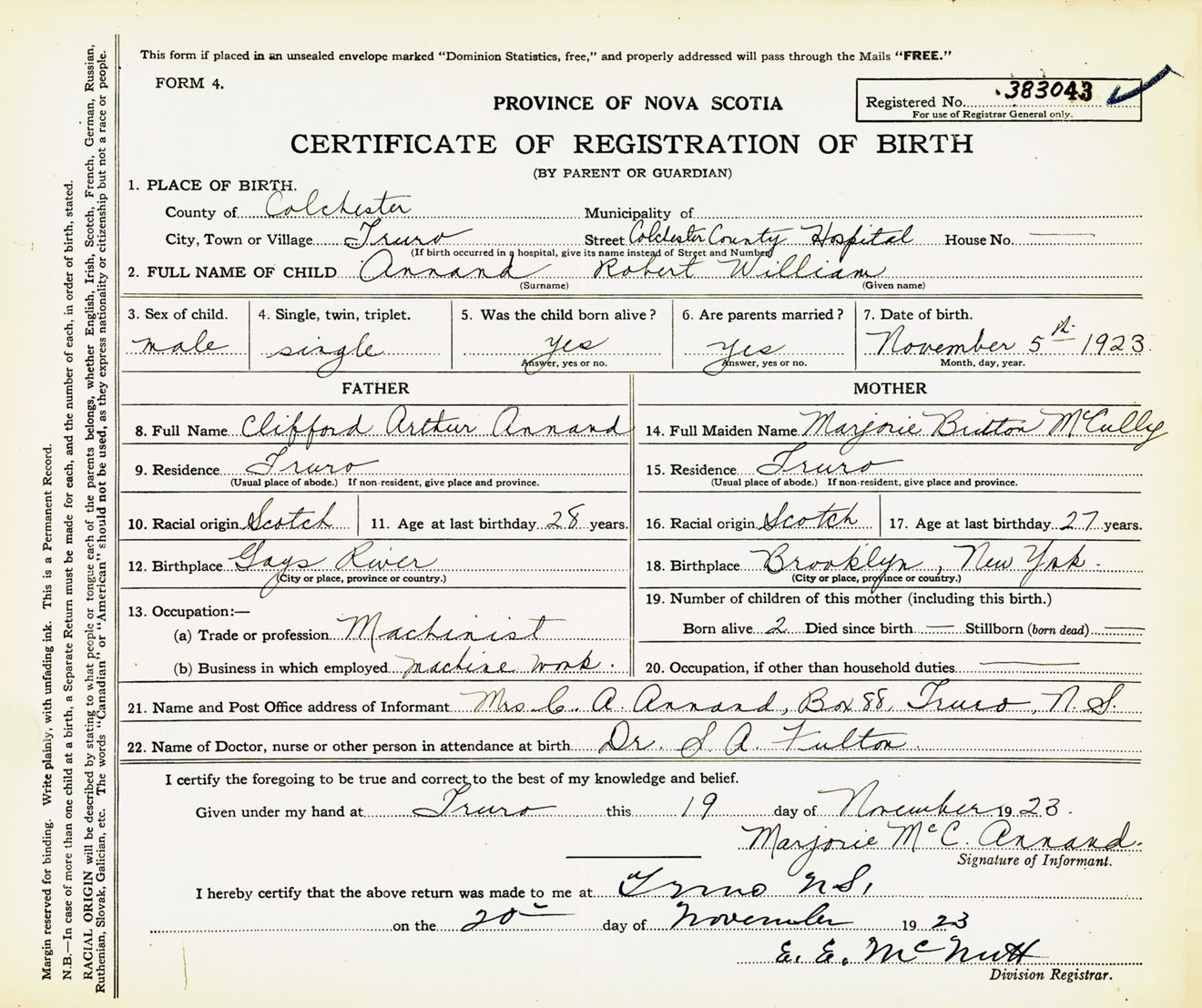 Male Birth Registration: Year: 1923 number: 38300043