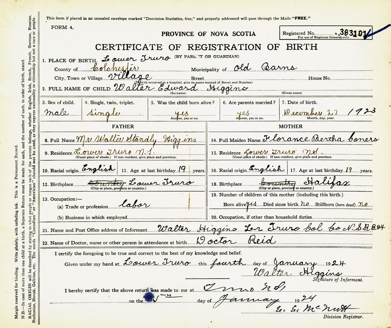 Male Birth Registration: Year: 1923 number: 38300101