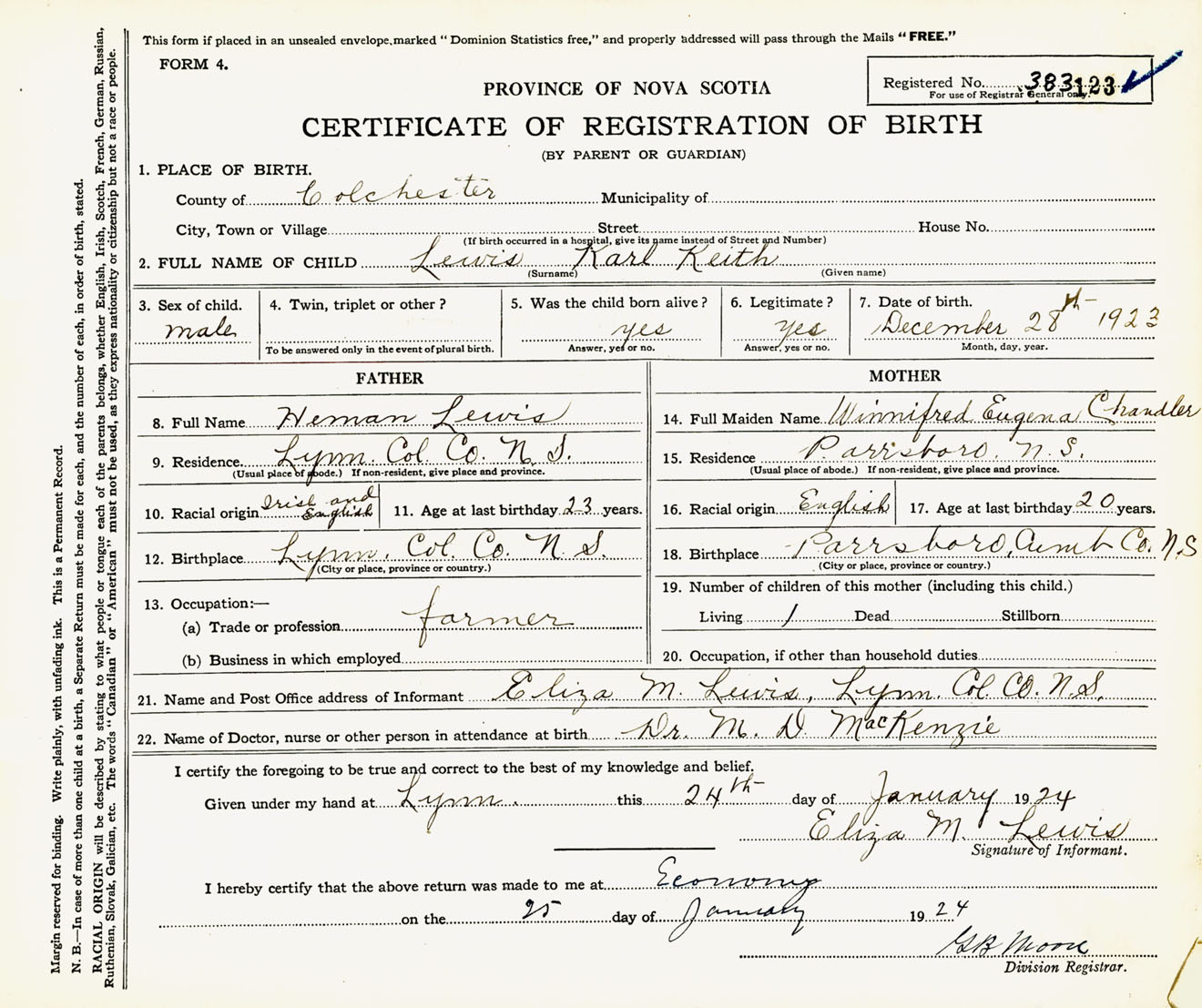 Male Birth Registration: Year: 1923 number: 38300123