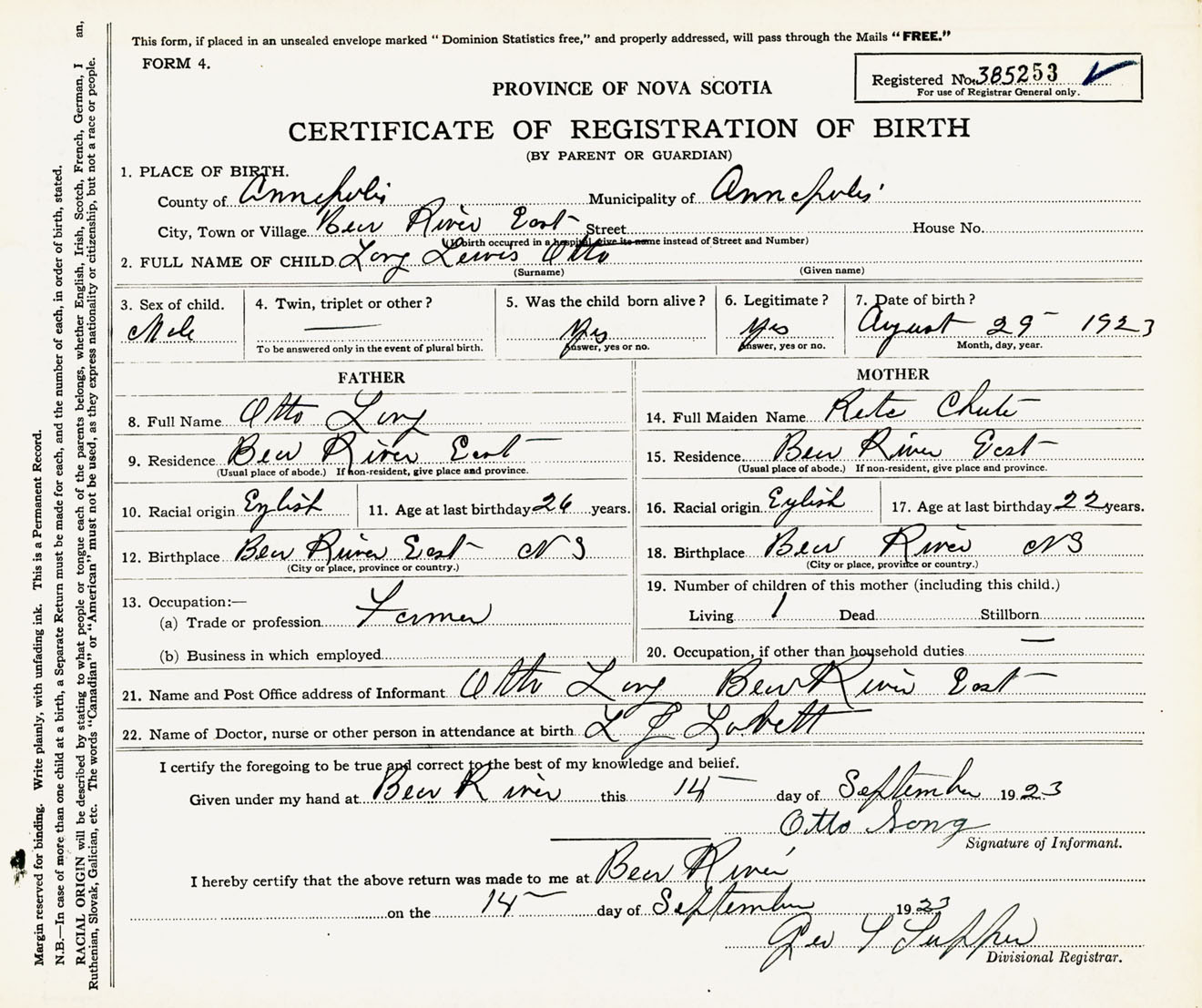 Male Birth Registration: Year: 1923 number: 38500253