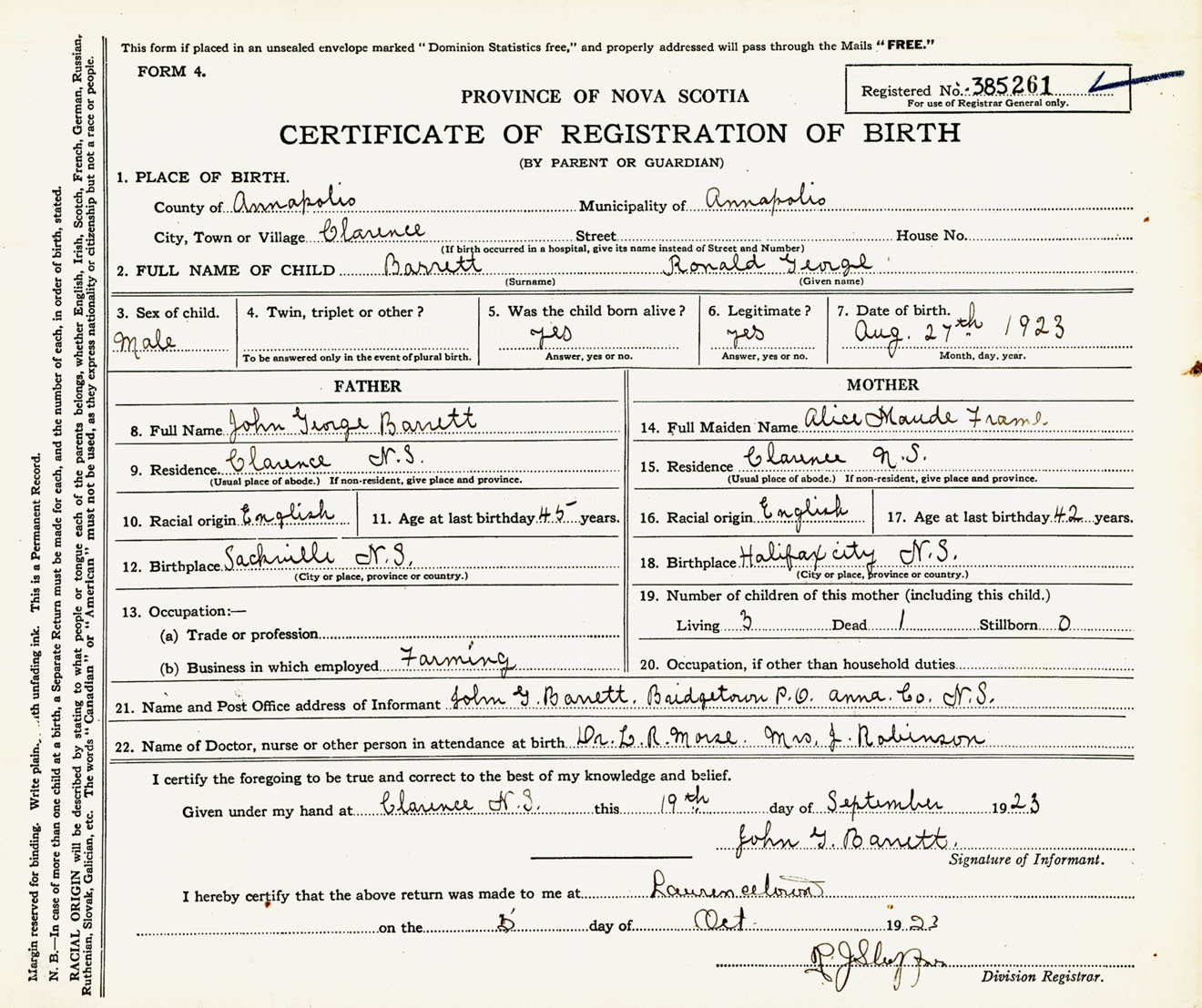 Male Birth Registration: Year: 1923 number: 38500261