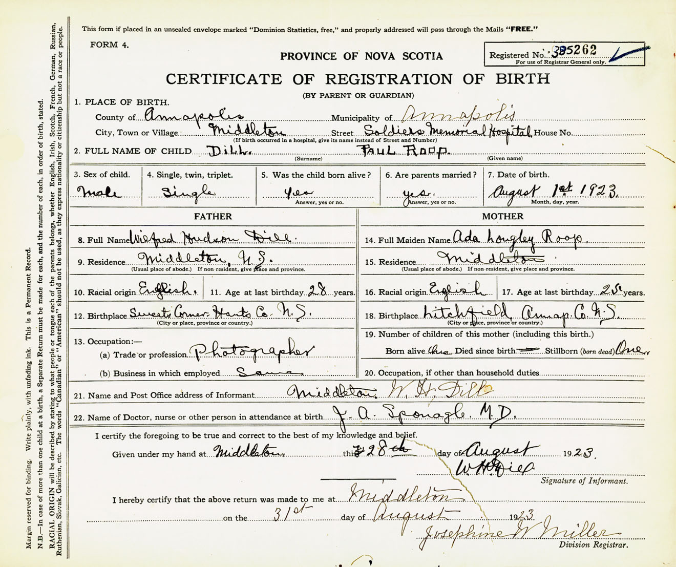 Male Birth Registration: Year: 1923 number: 38500262