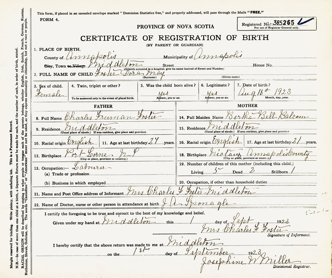 Female Birth Registration: Year: 1923 number: 38500265