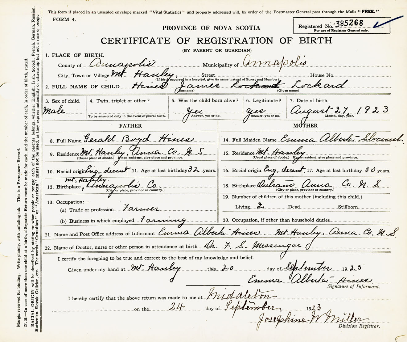 Male Birth Registration: Year: 1923 number: 38500268