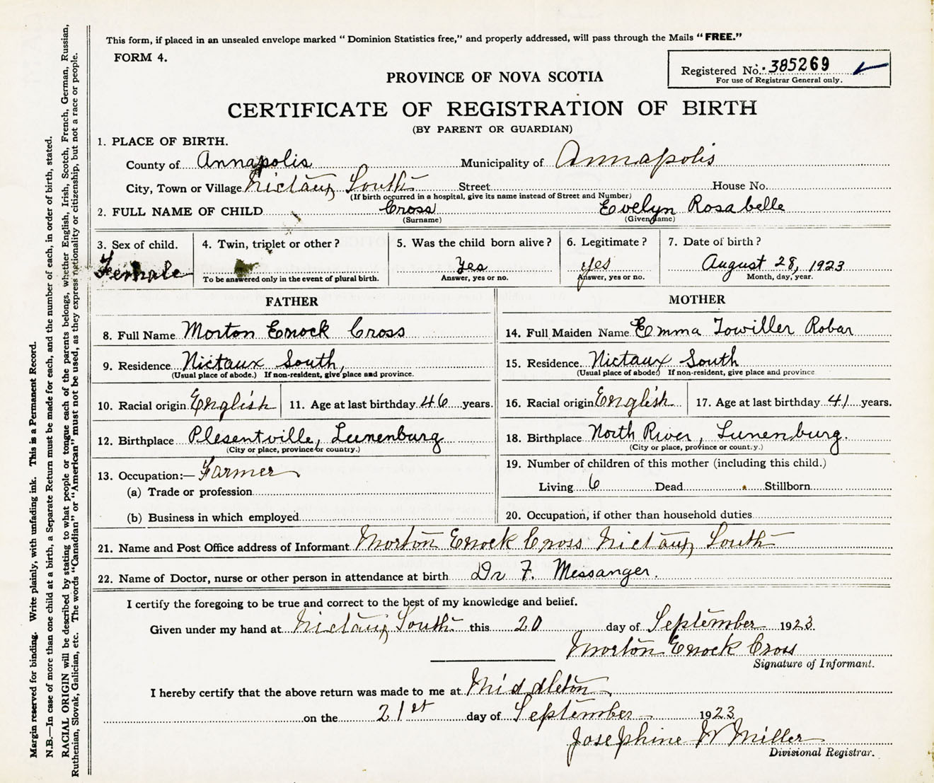 Female Birth Registration: Year: 1923 number: 38500269