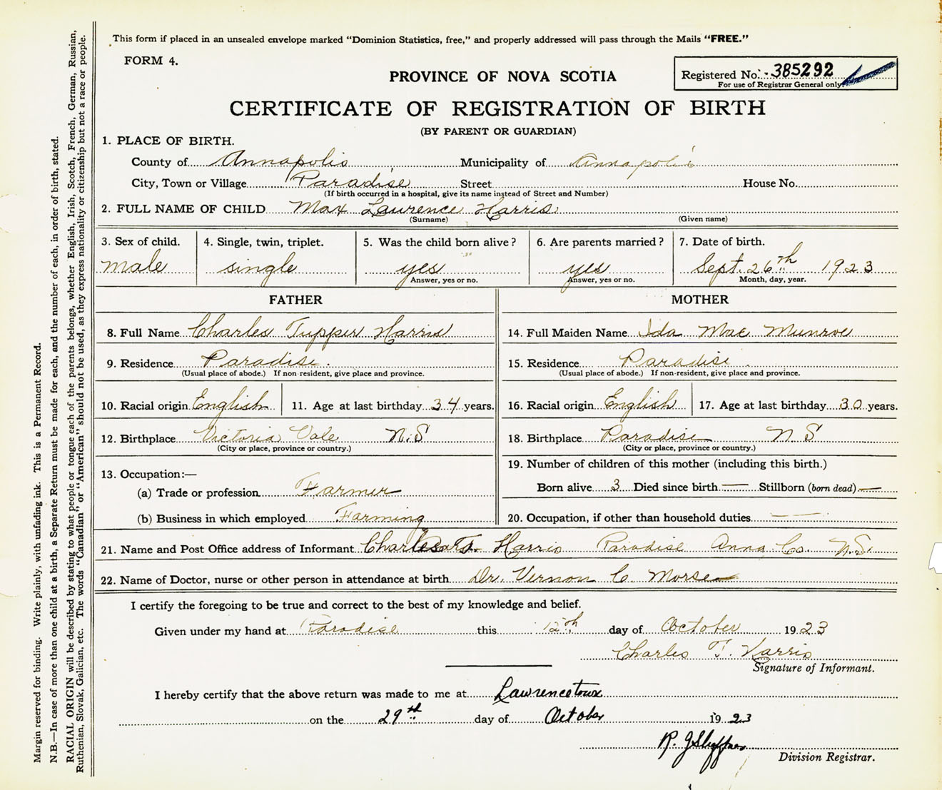 Male Birth Registration: Year: 1923 number: 38500292